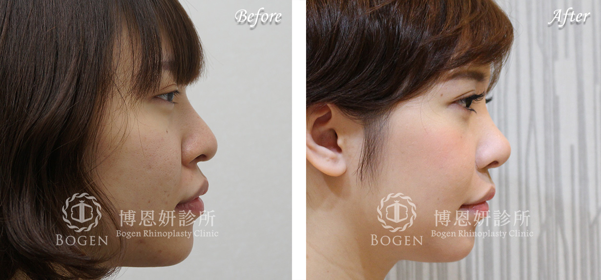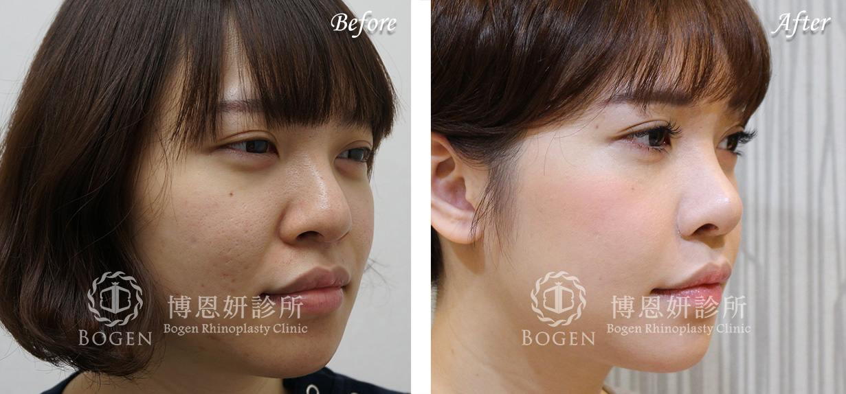 可見略為弧線的鼻樑取代過直甚至鷹勾的假體鼻,同時利用全自體軟骨的鼻頭取代強烈異物感的人工骨鼻頭。豐潤的鼻頭與微窄的鼻翼達到年輕女孩秀氣的效果,患者與醫師同時覺得安全有保障。最終利用貴族手術(法令紋手術)增加中臉與法令的飽滿度。