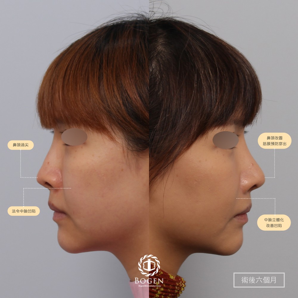 案例C女士,對初次隆鼻後的效果不甚滿意,除了發生歪鼻的問題,鼻樑的不平順及整體鼻形(鼻樑+鼻頭)太乾,因此決定重修調整,且在鼻頭的部分,張簡醫師使用「鼻頭豐滿術」讓整體鼻形更加飽滿。