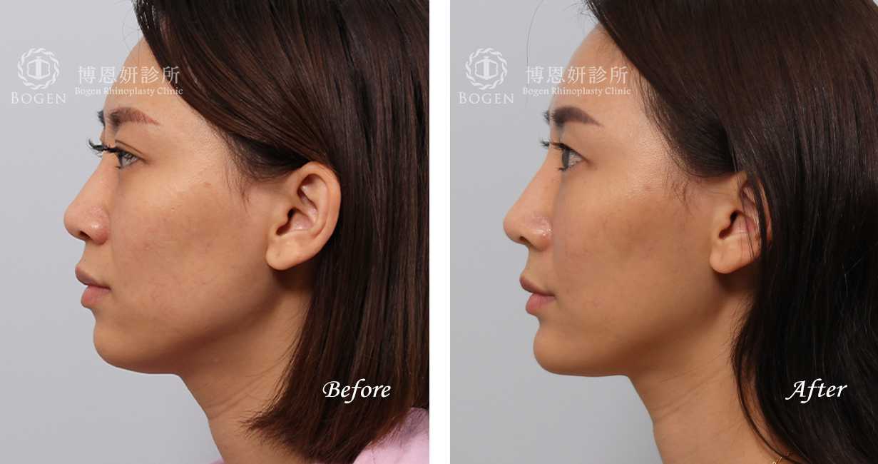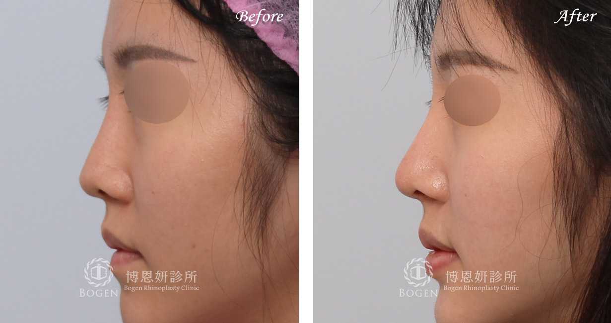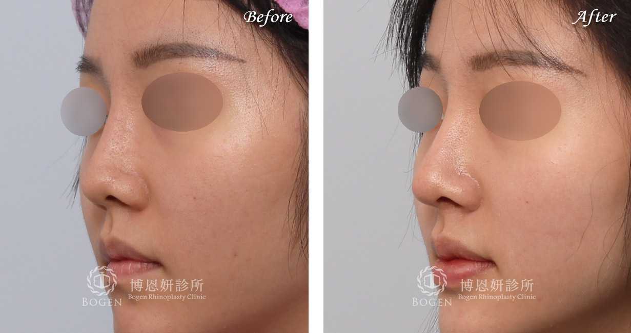 患者自肋隆鼻術後恢復良好,術後取肋傷口不會特別疼痛,一週拆線後即返回職場。術後5個月患者鼻型改善,延長墊高的鼻頭將鼻樑柔順弧度襯托出來。關鍵的鼻孔協調性部分經重修後也對稱許多,終於完成患者多年未盡的心願。