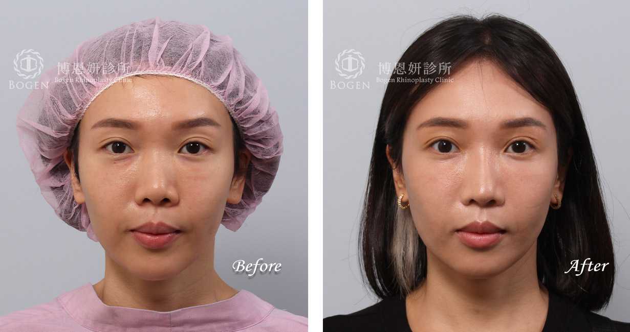 以案例皮皮為例,因前次手術矽膠假體發炎導致鼻子腫脹不堪。後來她選擇利用全自體肋軟骨進行假體置換與重修,手術後順利恢復,型態也比以往更為精緻。對於矽膠假體嚴重攣縮的情況,全自體肋軟骨可即刻救援且有效改善鼻型。