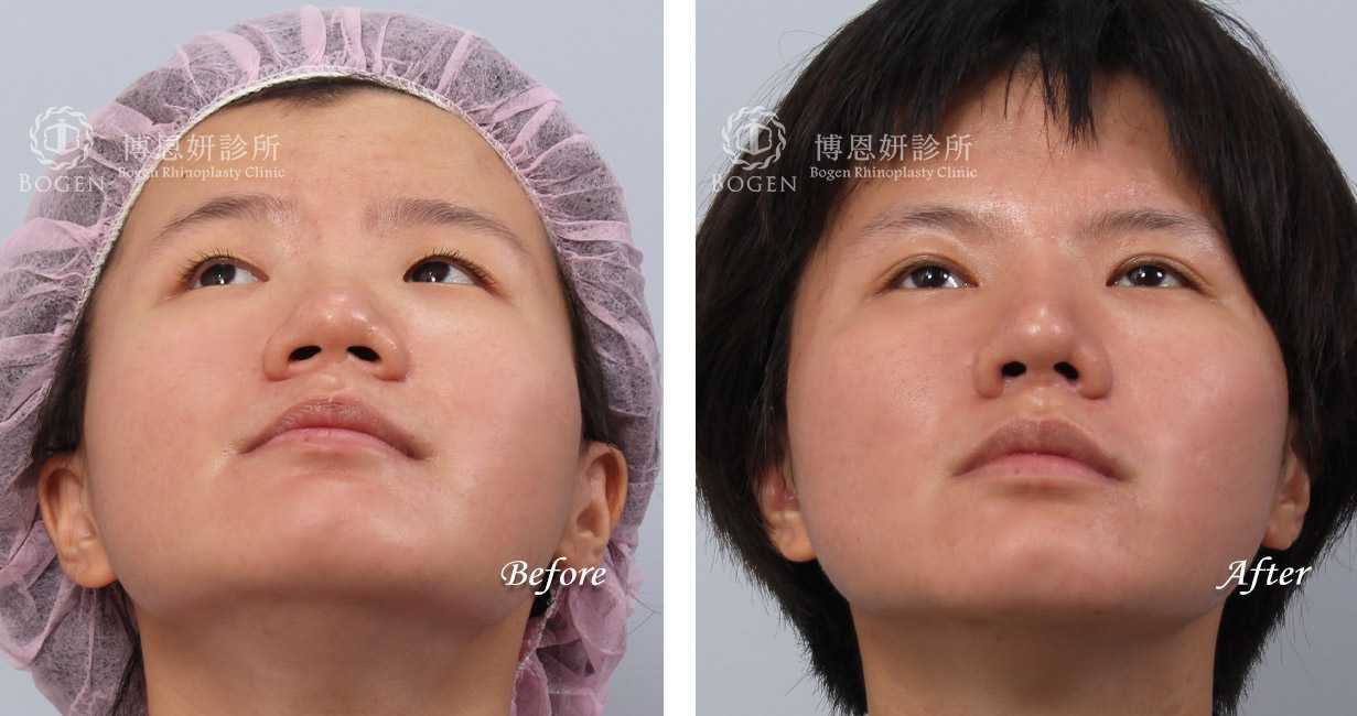L小姐原生鼻型屬於皮膚多且厚的蒜頭鼻,且是嚴重攣縮的患者,在結構式隆鼻術後出現較明顯的假性駝峰。假性駝峰往往在2D照片上不易呈現,但如果連照片都有明顯皮膚凸起,患者本人實際情況將會更為明顯。此類鼻型建議鼻頭修皮處理,效果更直接,反而打薄鼻頭脂肪效果不佳,還可能因腫脹和纖維化加劇假性駝峰。