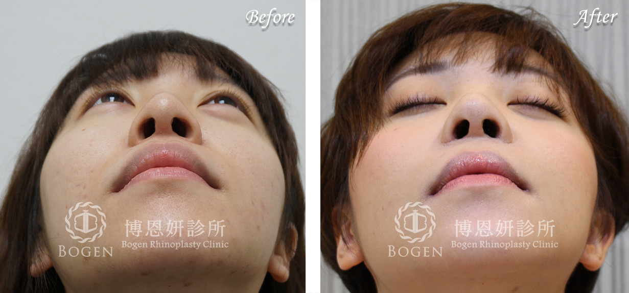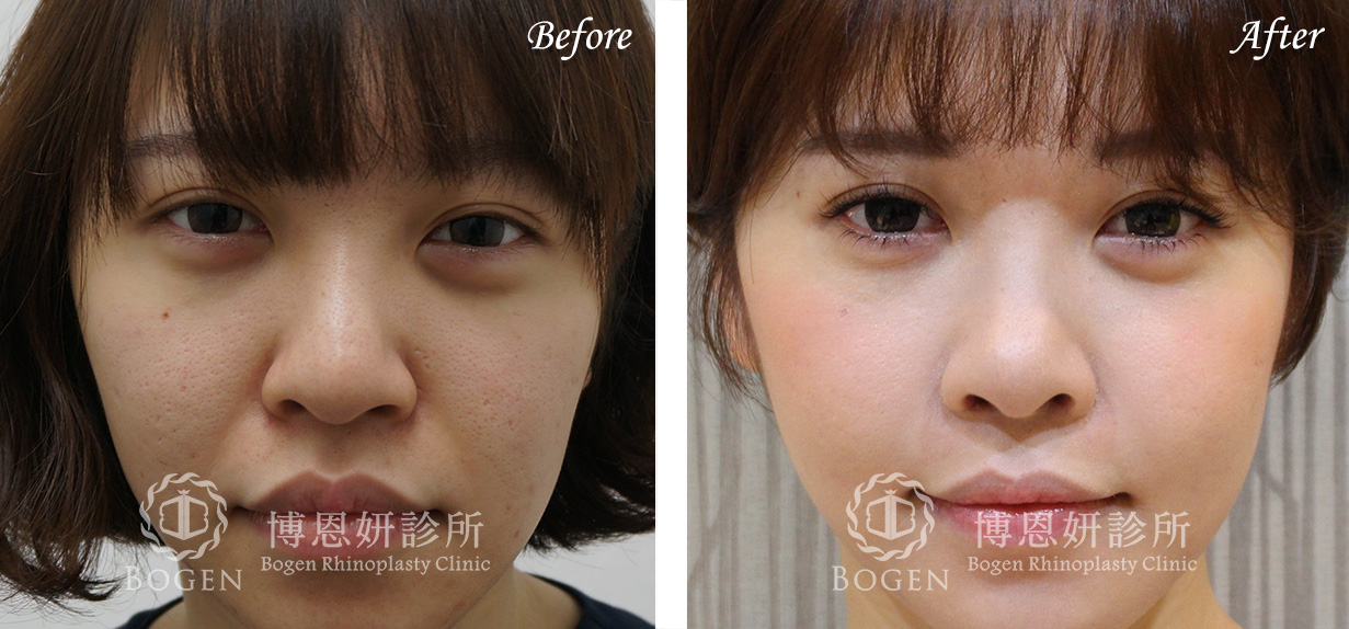 可見略為弧線的鼻樑取代過直甚至鷹勾的假體鼻,同時利用全自體軟骨的鼻頭取代強烈異物感的人工骨鼻頭。豐潤的鼻頭與微窄的鼻翼達到年輕女孩秀氣的效果,患者與醫師同時覺得安全有保障。最終利用貴族手術(法令紋手術)增加中臉與法令的飽滿度。
