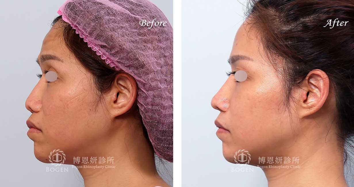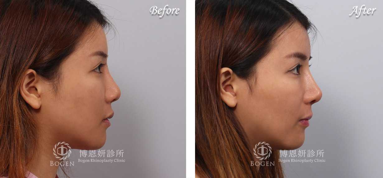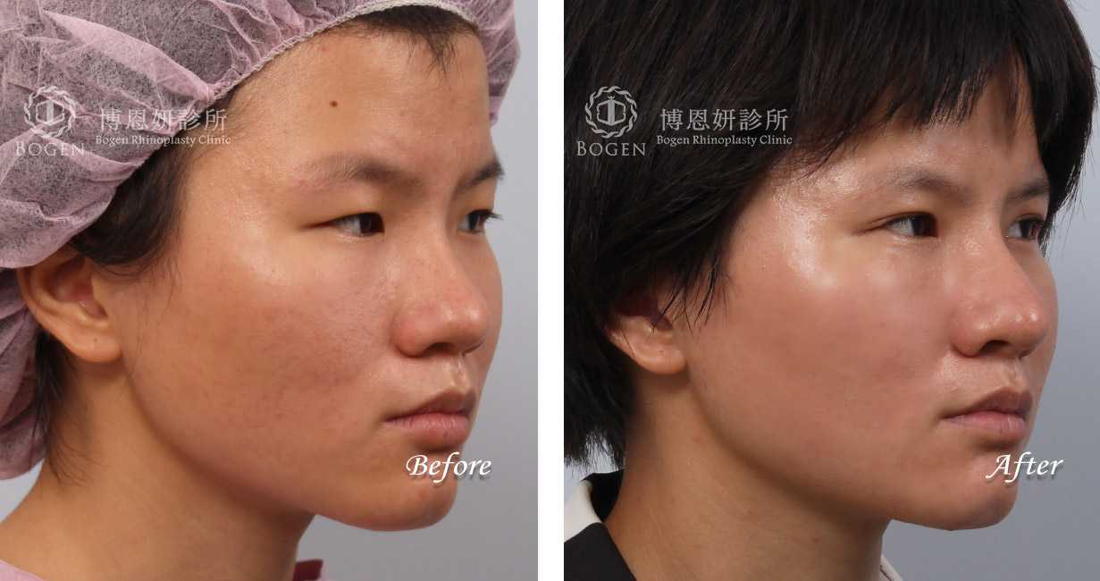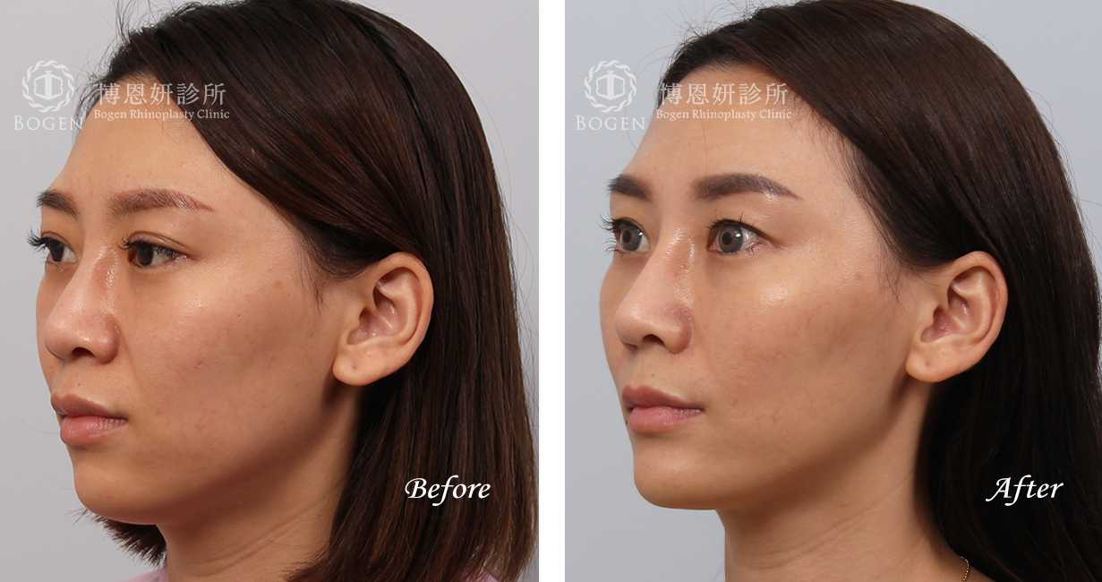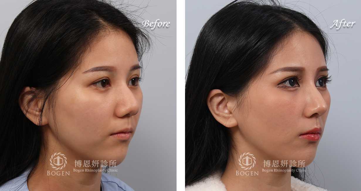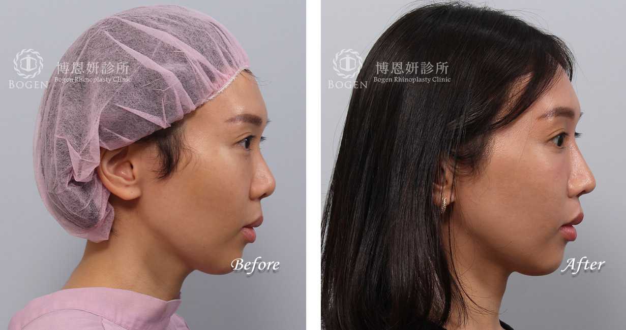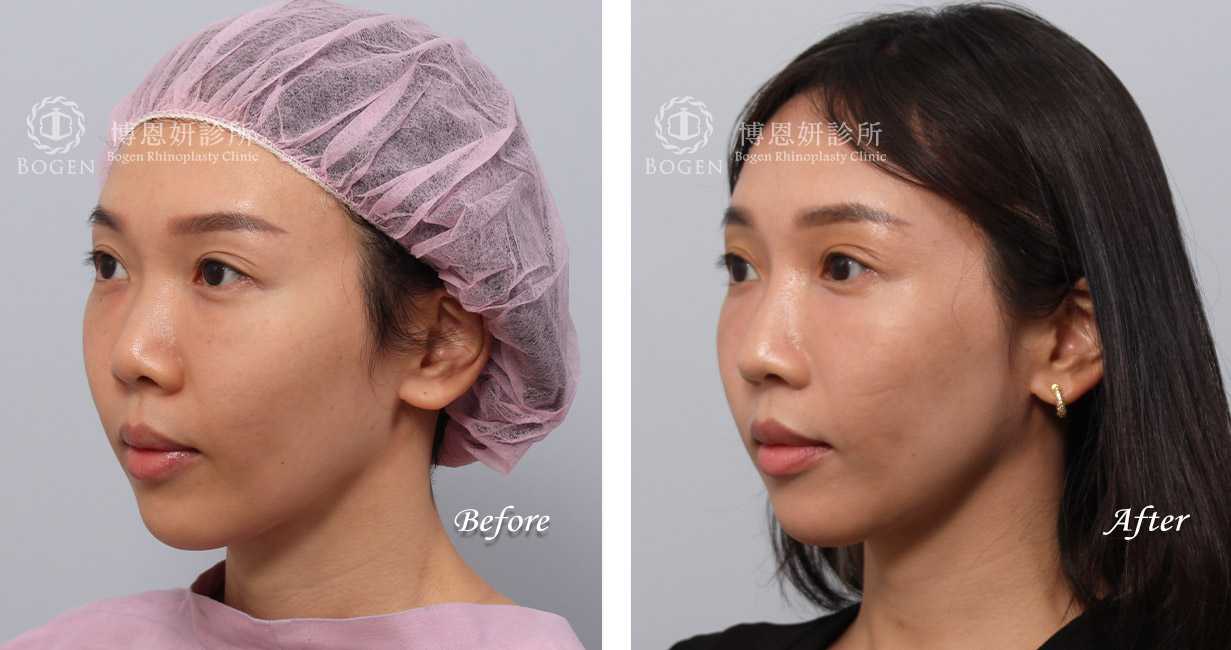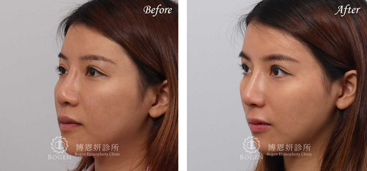 患者自肋隆鼻術後恢復良好,術後取肋傷口不會特別疼痛,一週拆線後即返回職場。術後5個月患者鼻型改善,延長墊高的鼻頭將鼻樑柔順弧度襯托出來。關鍵的鼻孔協調性部分經重修後也對稱許多,終於完成患者多年未盡的心願。