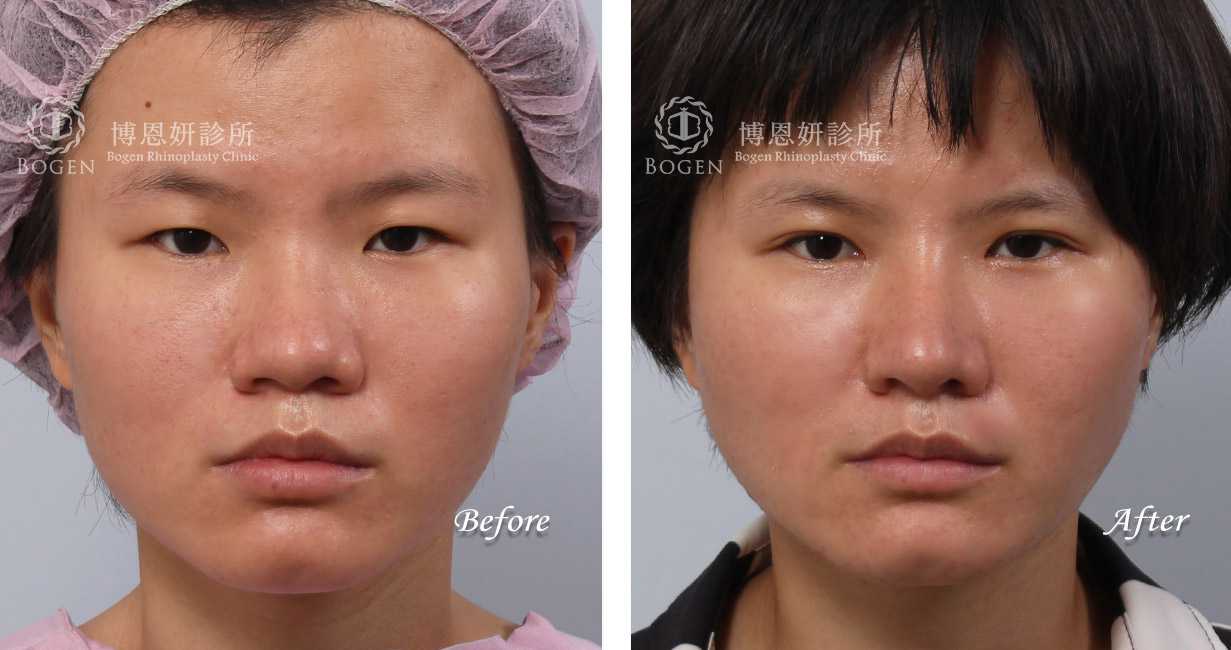 以案例皮皮為例,因前次手術矽膠假體發炎導致鼻子腫脹不堪。後來她選擇利用全自體肋軟骨進行假體置換與重修,手術後順利恢復,型態也比以往更為精緻。對於矽膠假體嚴重攣縮的情況,全自體肋軟骨可即刻救援且有效改善鼻型。