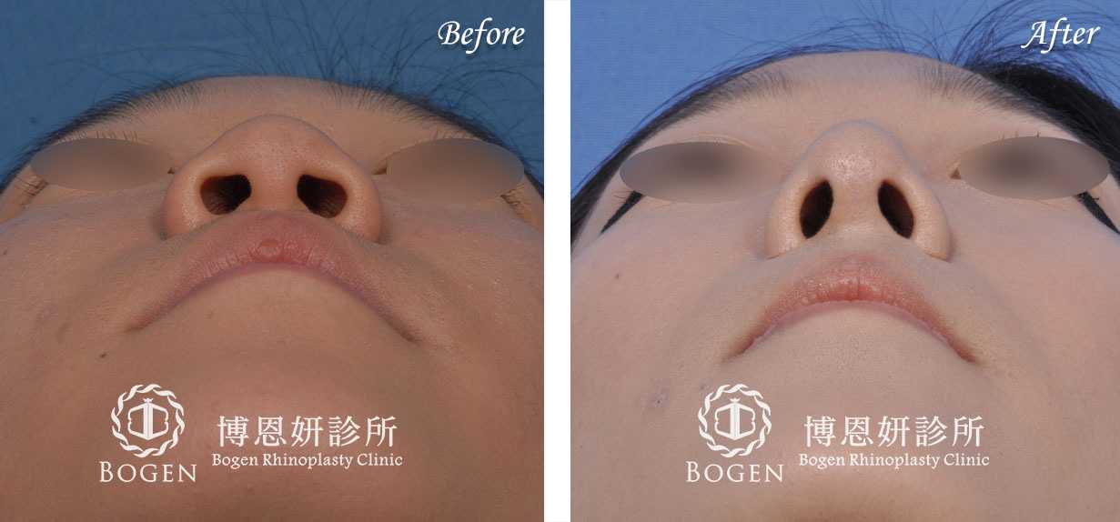 鼻翼環過長,鼻孔底寬度適中。過長的鼻翼環造成鼻孔型態不佳,縮鼻翼手術規劃,會搭配縮鼻頭手術一起進行,有的患者也會進行結構式隆鼻改善鼻頭高度。單純進行鼻翼環調整的鼻翼手術,不會影響到鼻孔底。一般來說疤痕更不明顯,也能有不錯的改善效果。