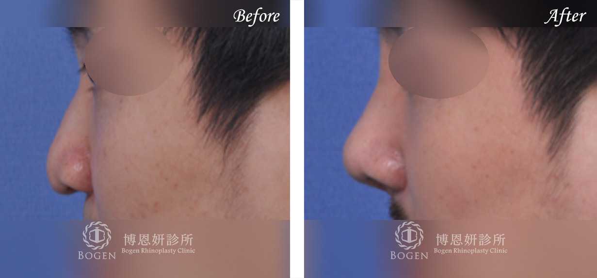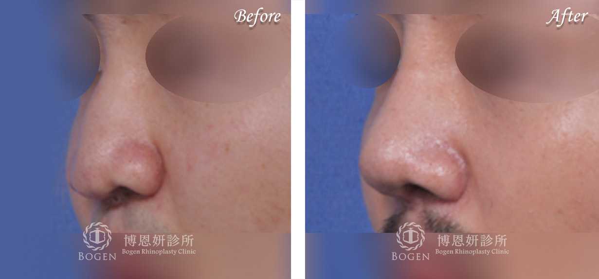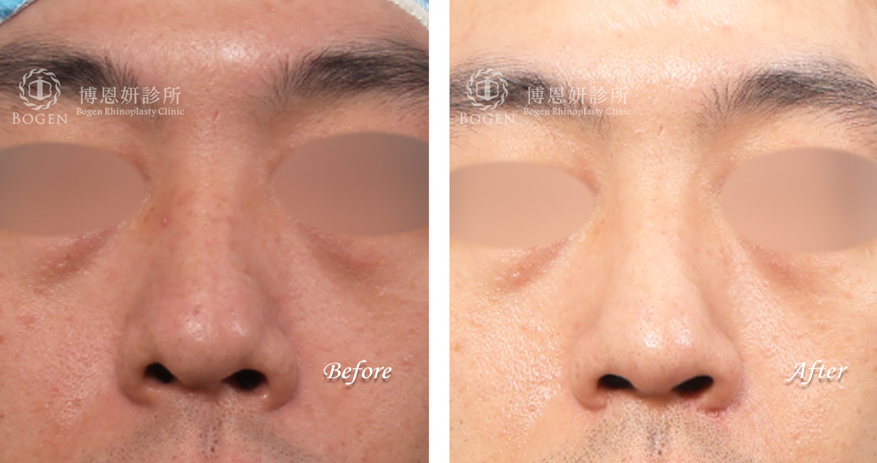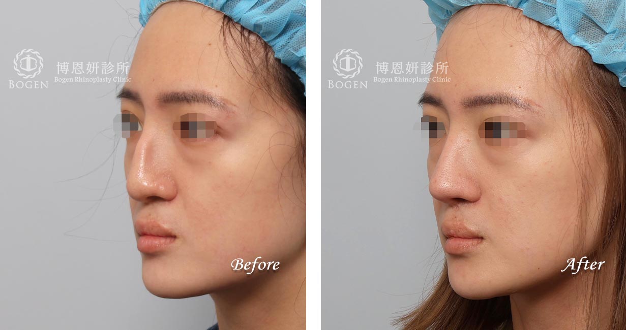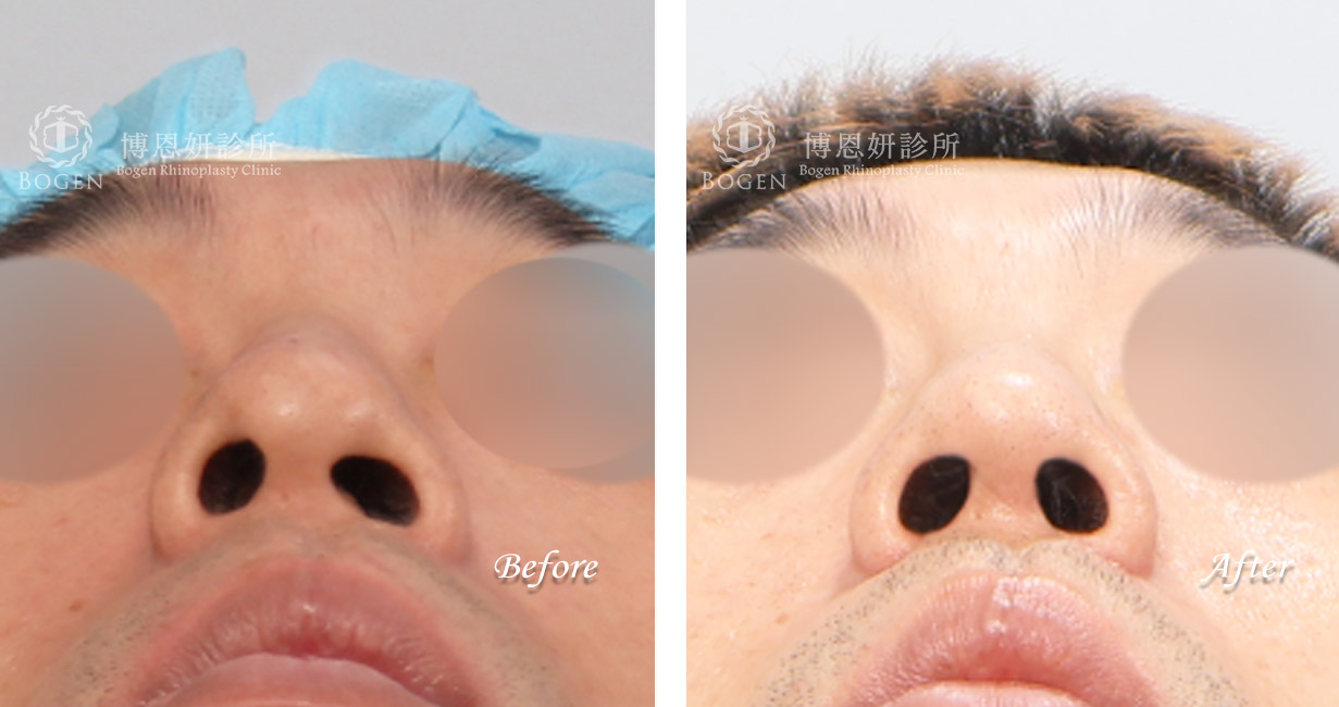 張簡仕煌院長利用自體肋軟骨搭配卡麥拉鼻模進行鼻重修,移除過高而且不適合的Goretex假體,進行鼻中膈彎曲矯正歪斜鼻頭,搭配鼻骨截骨喬正偏移鼻樑,最後利用局部皮瓣與翹翹板手術技巧修正歪斜鼻小柱與不對稱鼻孔。